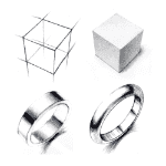 スケッチに必要な遠近法を学び、立方体の描写からリングの基本形までを実習。光と影の方向などを理解し、立体的に見える表現方法を習得します。