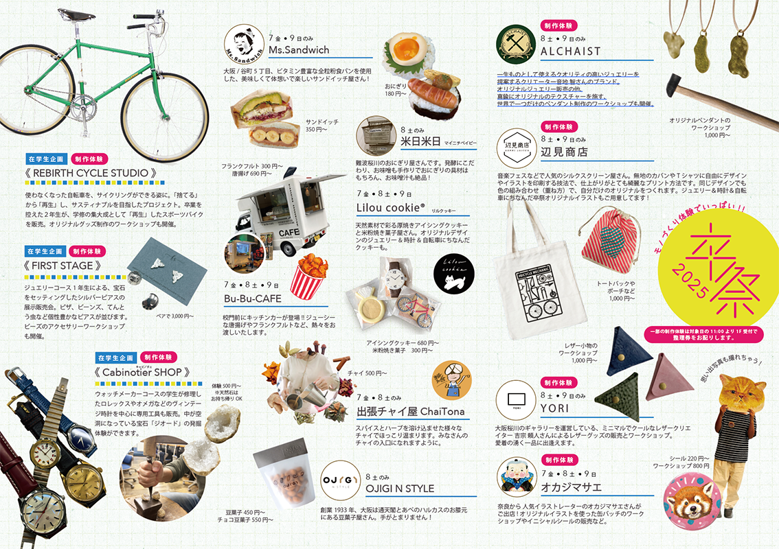 ジュエリーの卒業制作作品の展示のほか、ヴィンテージウォッチ販売、学生が修理・再生した自転車の販売、外部からの出店者様による物販、軽食販売など、楽しいコンテンツが目白押し!